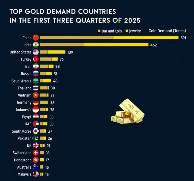 در این میان، بررسی کشورها نشان می‌دهد چین با 591 تن و هند با 462 تن همچنان دو قدرت بلامنازع بازار جهانی طلا هستند و بیش از نیمی از کل تقاضای جهان را به خود اختصاص داده‌اند. پس از این دو کشور، ایالات متحده (109 تن)، ترکیه (76 تن) و ایران (58 تن) در رتبه‌های بعدی قرار گرفته‌اند.